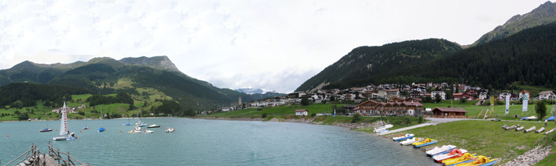 Und zum friedlichen Abschluss: So sieht Reschen vom Reschensee aus, jedenfalls der nach der Flutung wieder aufgebaute Teil.