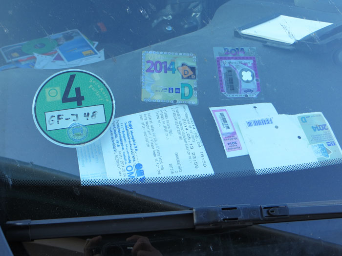 Und so sieht nach dem ersten Tag meine Beifahrerseite aus. Rechts neben dem Umweltsiegel die 10-Tages-Tickets für
