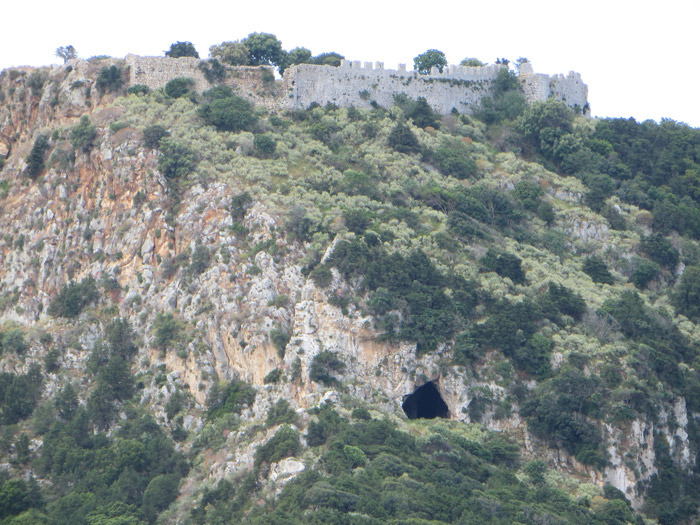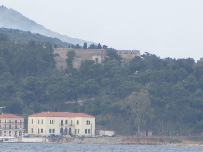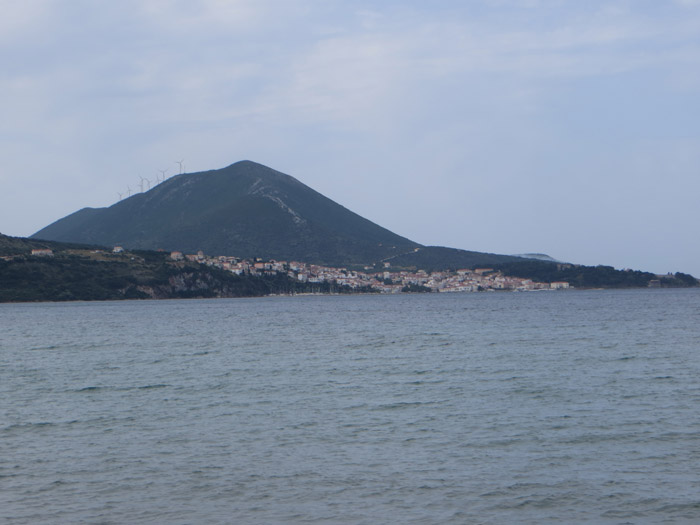 Am Morgen haben wir vom Strand des Campingplatzes aus Pilos und die Burg (rechts über dem letzten Haus)