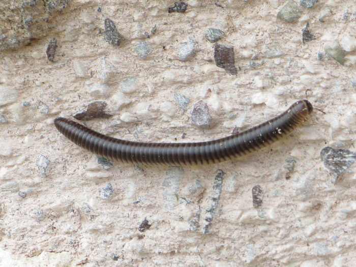 Auf der Mauer auf der Lauer wanderte dieser 5 cm lange Hundertfüßler rum. Er hängt gerade an der senkrechten Wand.