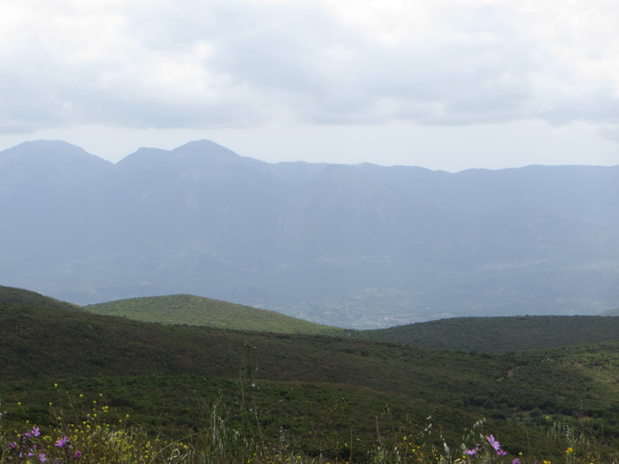Und jetzt kommt Geisterstimmung auf. Hinter dieser Bergkette hinten liegt Mystras, eine verlassene byzantinische Siedlung.