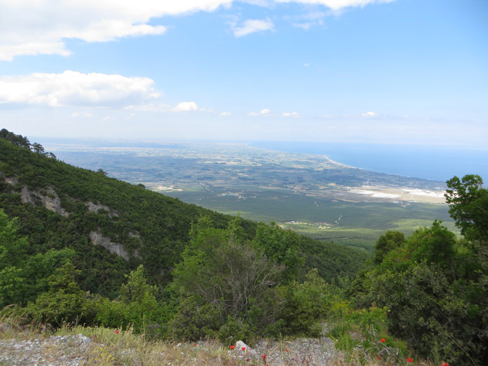 Die 17 km sind aber nicht Luftlinie, denn es geht aufwärts. Zunächst bis zum Ort Prionia in 1100 m Höhe.