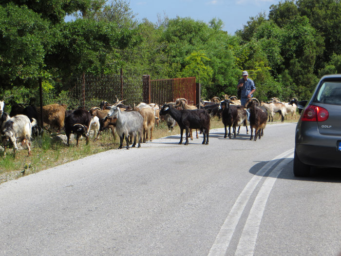 Auch das gehört in Griechenland zum Straßenbild dazu. Man begegnet schon mal einer Herde, in diesem Fall Ziegen.