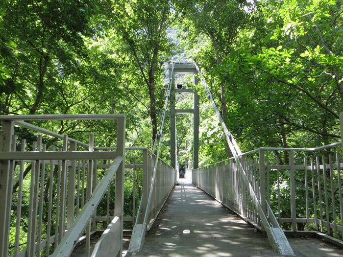 Allerdings muss man erst noch über diese Hängebrücke den Pinios überqueren.