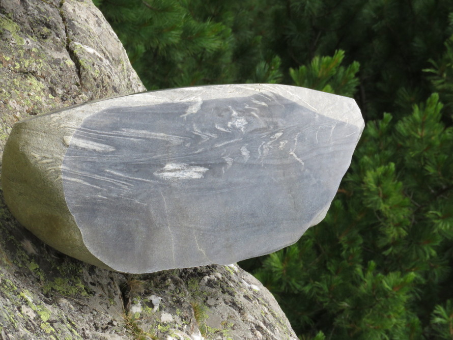 Amphibolit und Quarz poliert und auf einem Findling befestigt.
