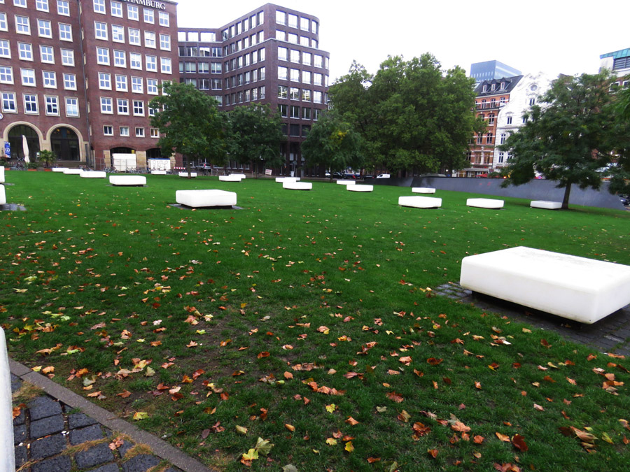Und begrenzt ist der Platz durch die Metallmauer, die die Lage der früheren Hammaburg anzeigen soll.