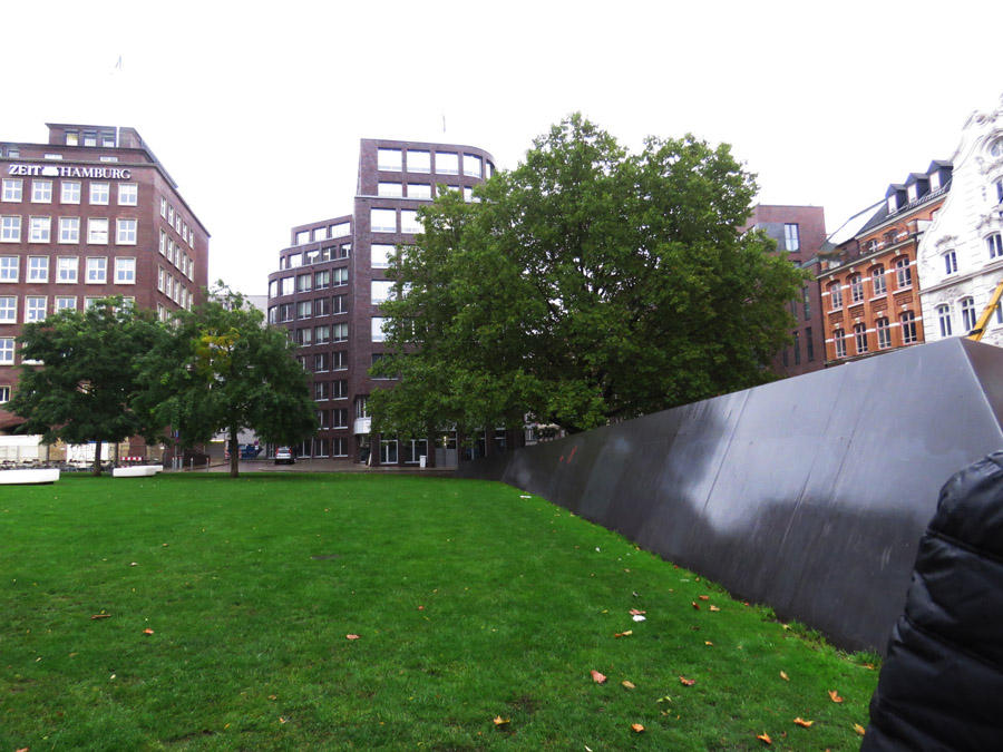 Und begrenzt ist der Platz durch diese Metallmauer, die die Lage der früheren Hammaburg anzeigen soll.