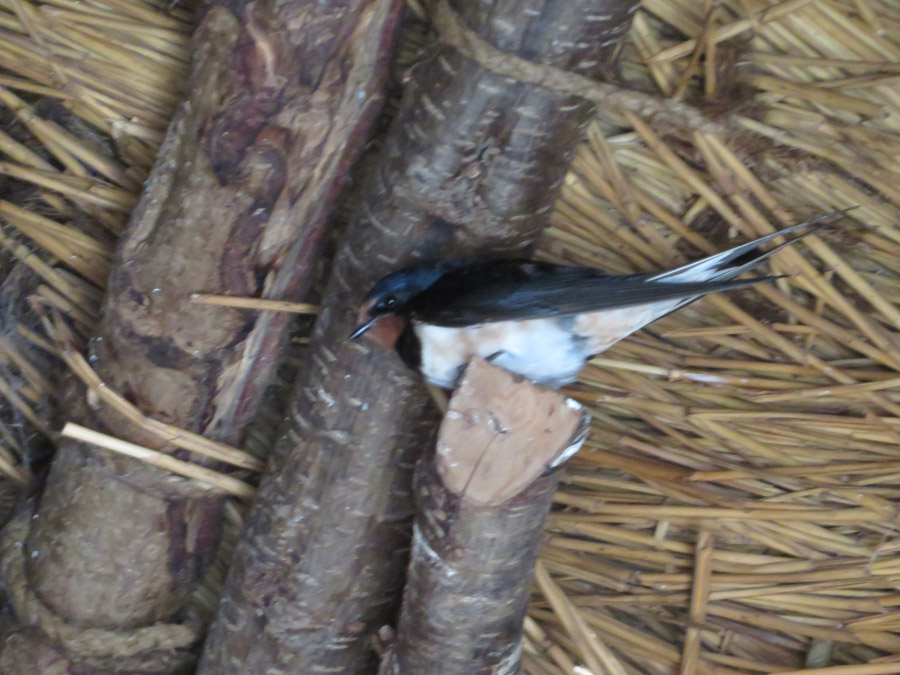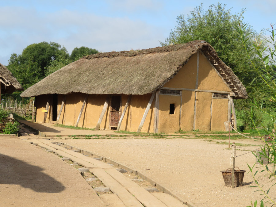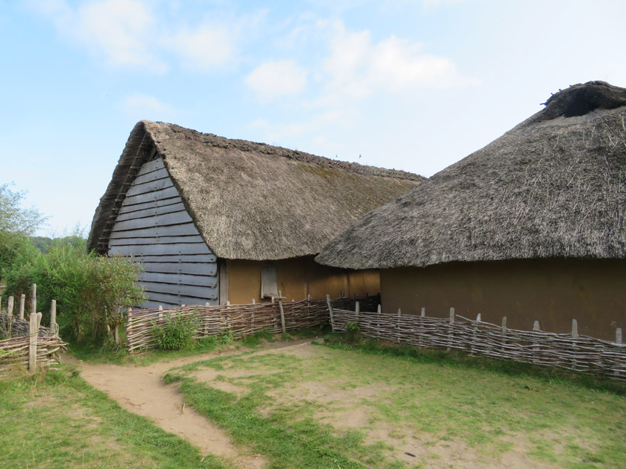 Fachwerk mit Lehm abgedichtet und Strohdach. Der Flechtzaun hielt