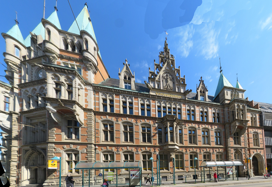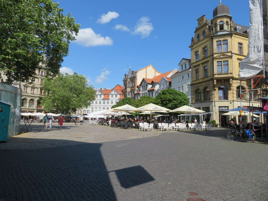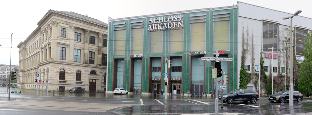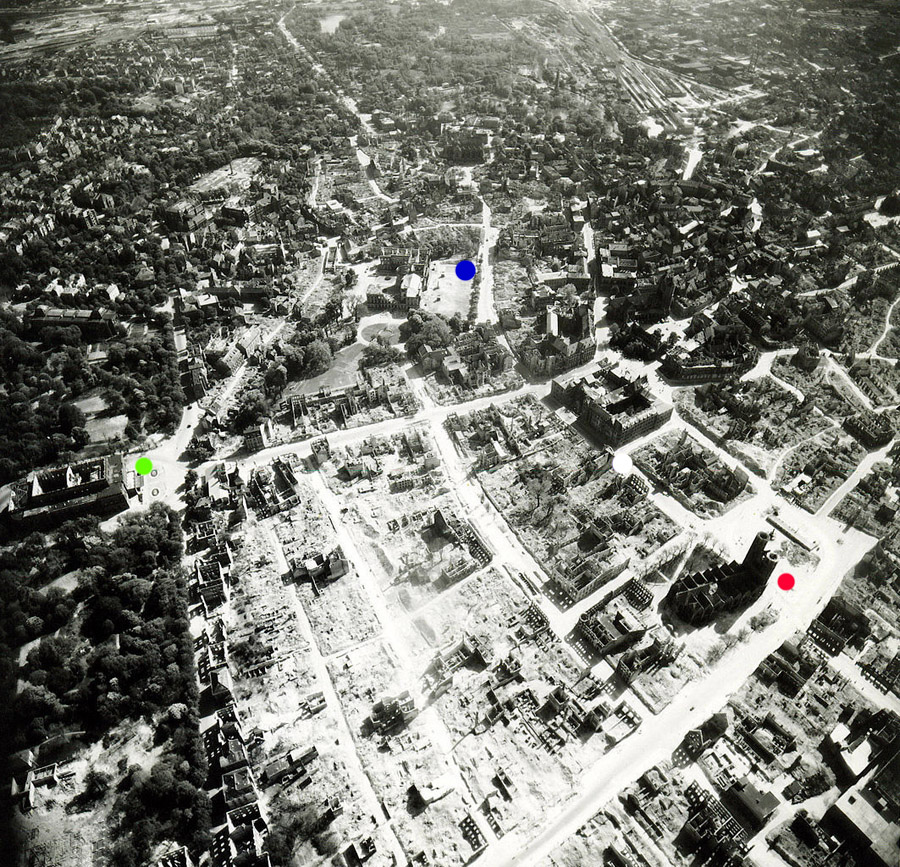 Katharinenkirche, blauer Punkt: Schloss, grüner Punkt: Staatstheater.