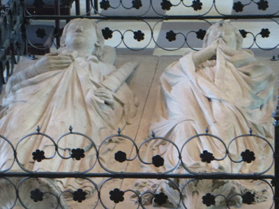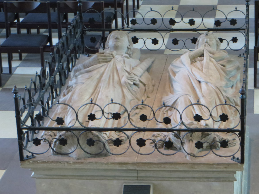 Grabplatte für ihn und seine Frau im Dom, in der Krypta die Särge