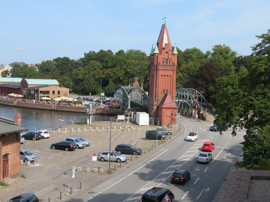 Daneben sieht man die Hafendrehbrücke. Sie "ist eine seit dem 5. Januar