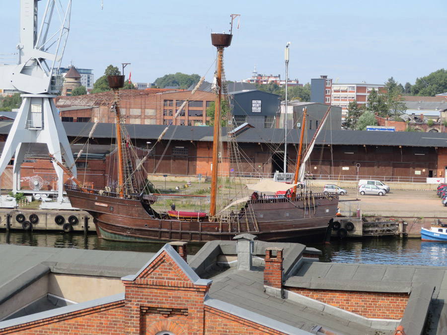 „Lübecker Kogge“, ein Nachbau einer Kogge, das olympische Feuer von