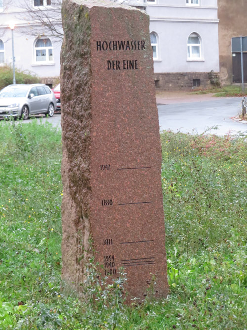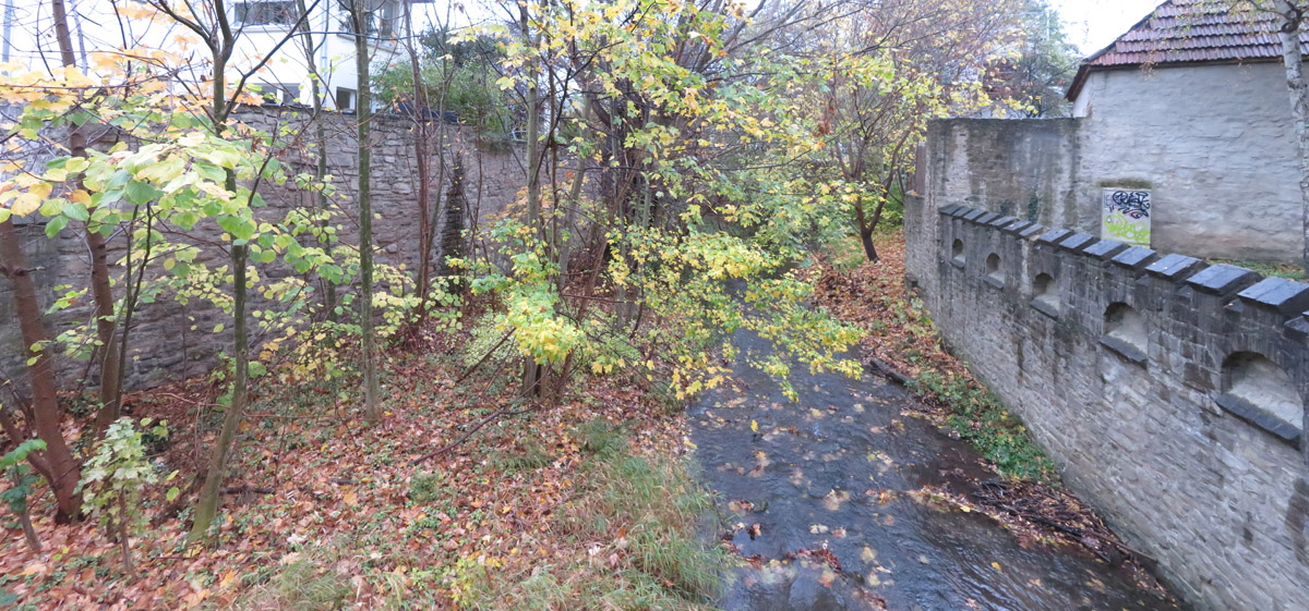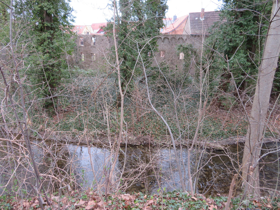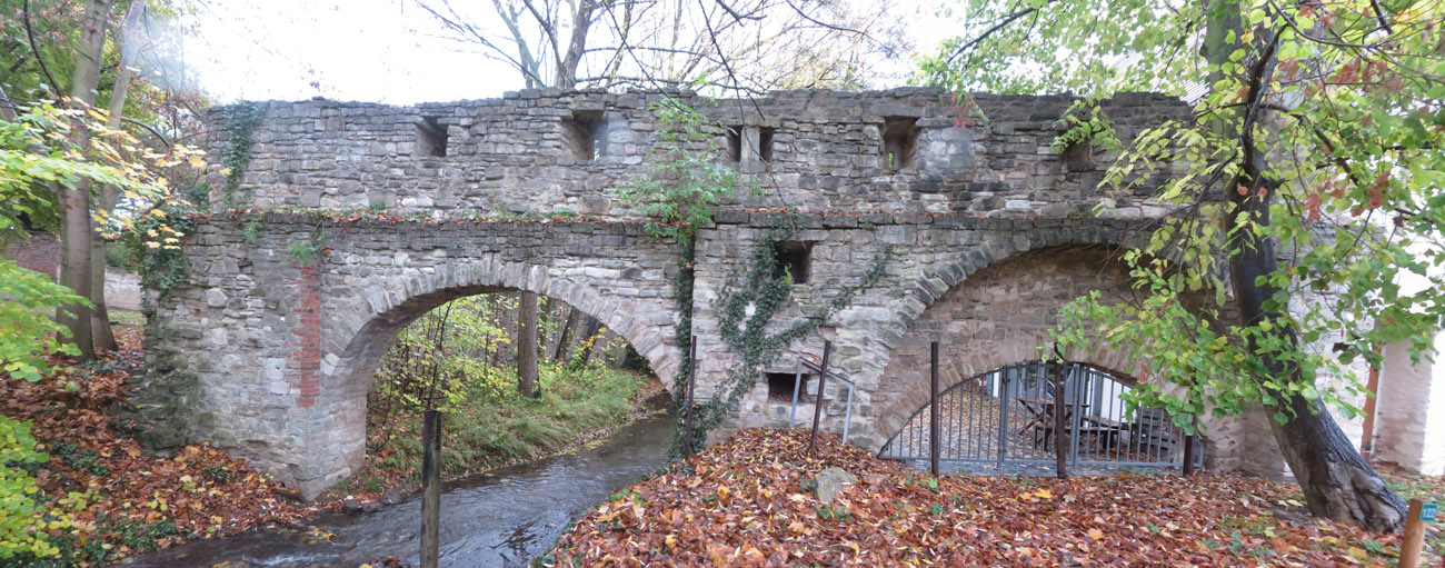 City stolpert man über die Eine und dahinter Reste der Mauer