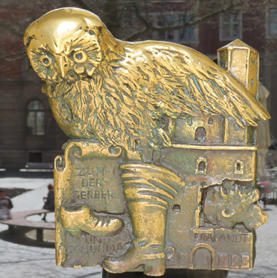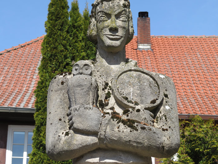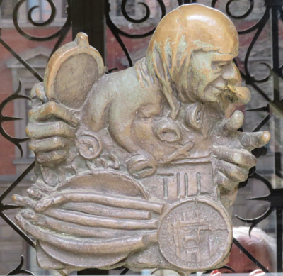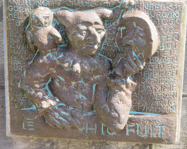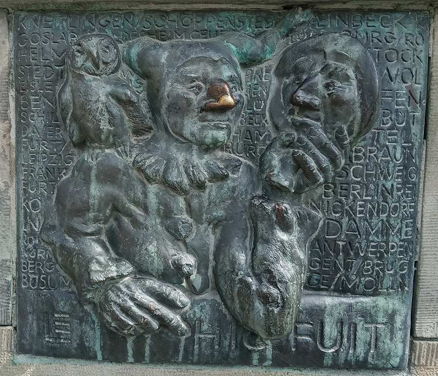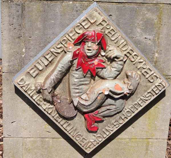 Plakette mit Eulenspiegel auf der Rückseite der Statue angebracht.