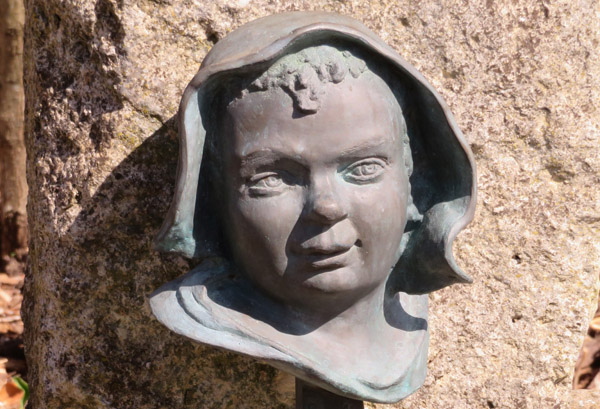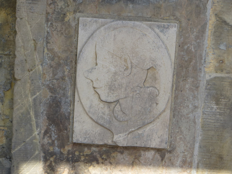 Davor steht ein brunnenähnlicher Steín mit einem Kindskopf. Till?