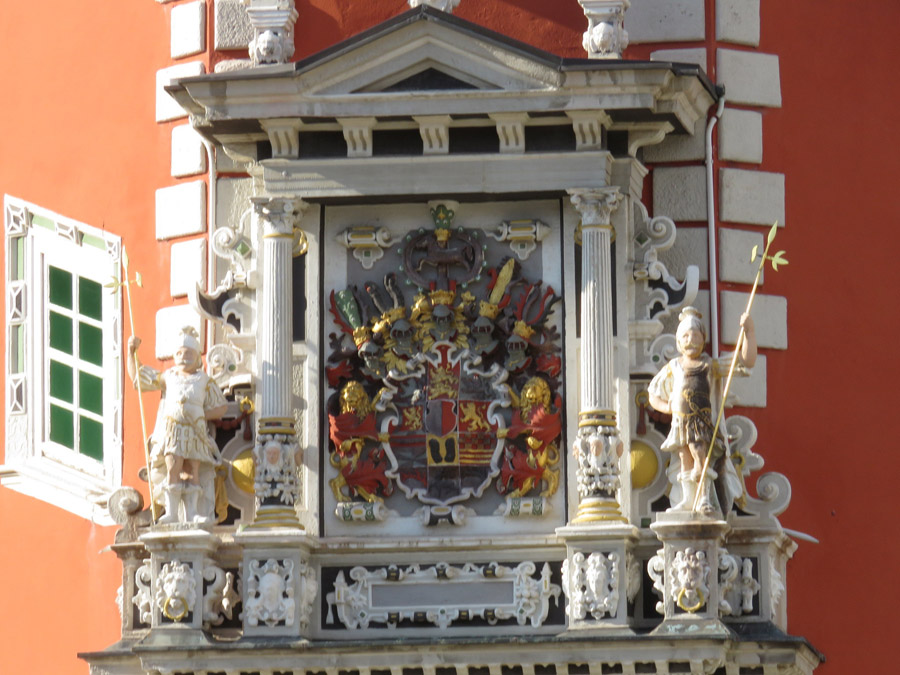Im Giebel prangt das kaiserliche Wappen und seitlich