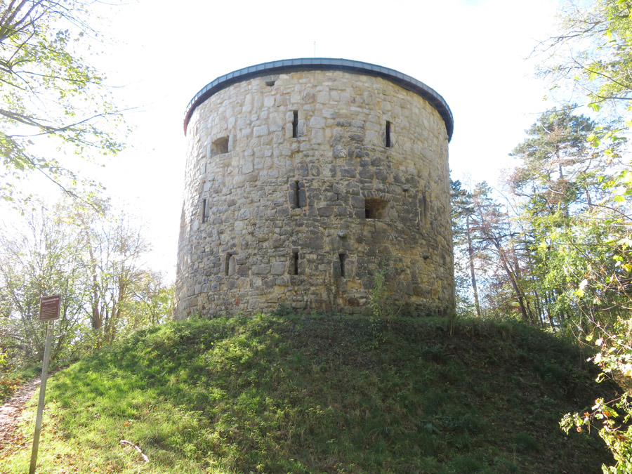 er, der ehemalige Bergfried der Burg. Er wurde außerhalb der Burg