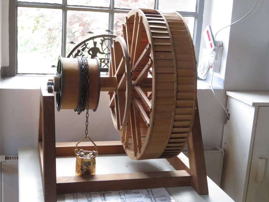 dass das Wasserrad zwei Seiten mit Wasserwannen in entgegegesetzer