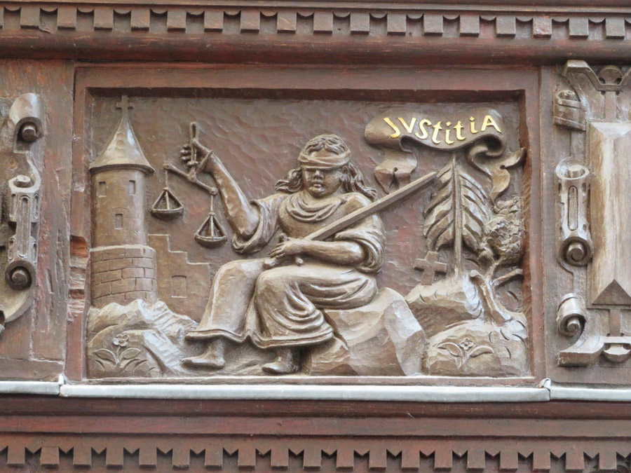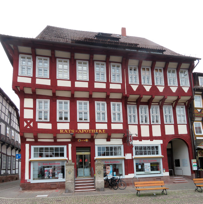 Rats-Apotheke wurde 1540 erbaut Vor dem Portal stehen Stelen mit Wappen