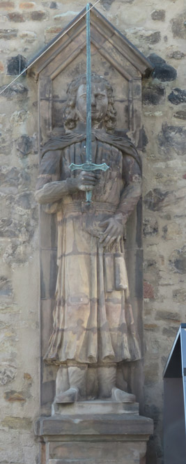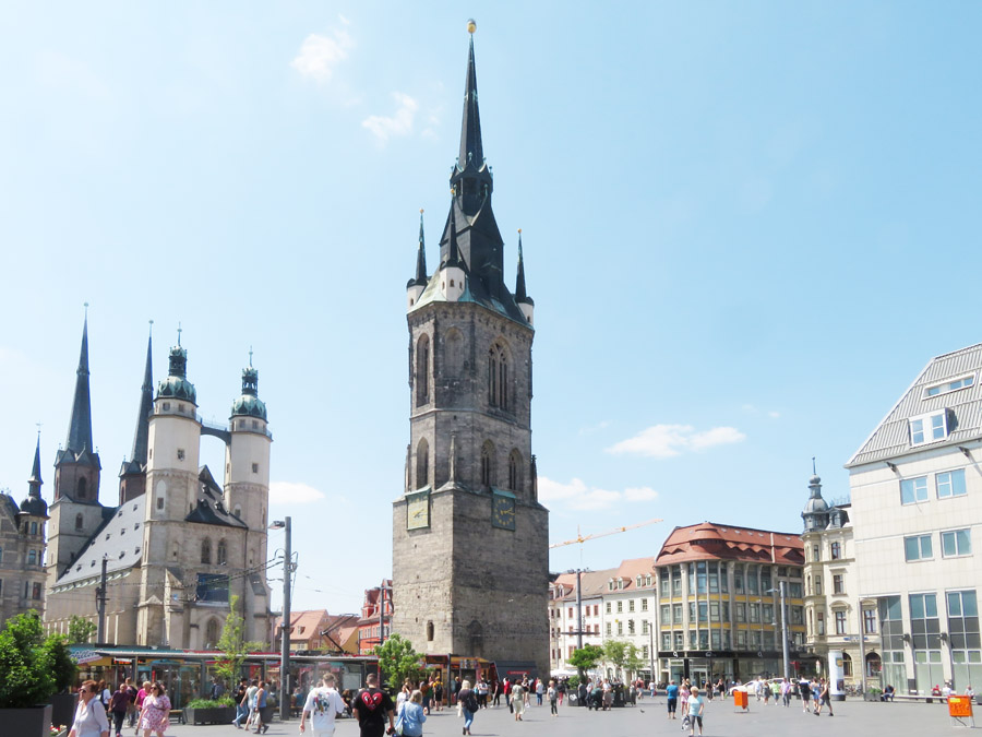 hohe Rote Turm, an dessen Basis der steinerne Roland von Halle wacht.