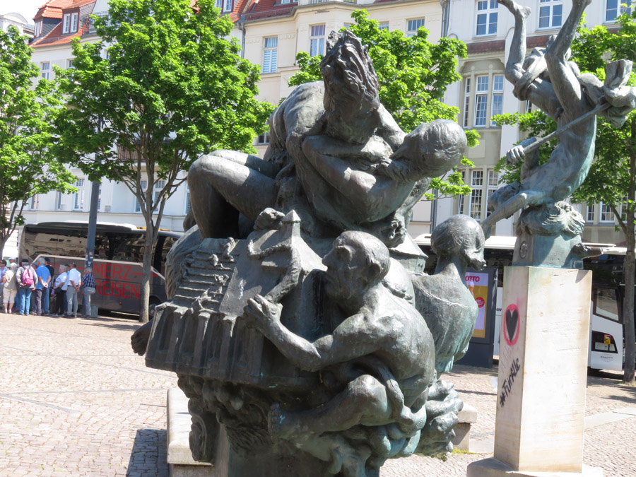 Hallmarkt steht der Göbel-Brunnen, in dem Szenen aus Halles Geschichte
