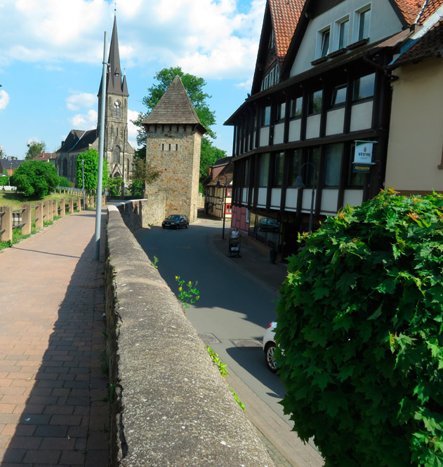 heute erhaltene Rest der Stadtmauer. Neben dem Turm schimmert die St.