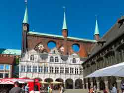 Im Rücken ist die Rückseite vom Rathaus zu sehen.