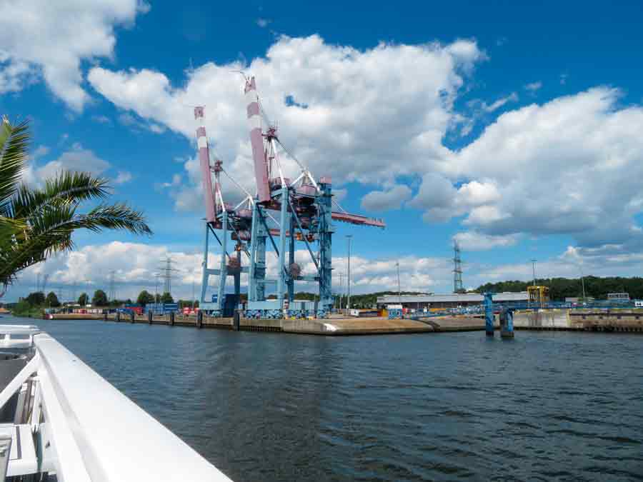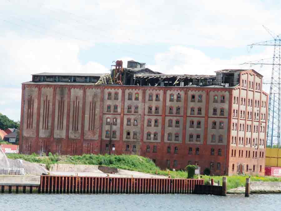 Und das Bild verbindet Travehafen und Speicherhäuser.