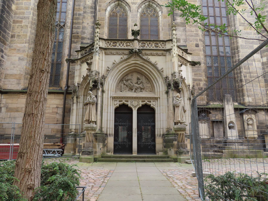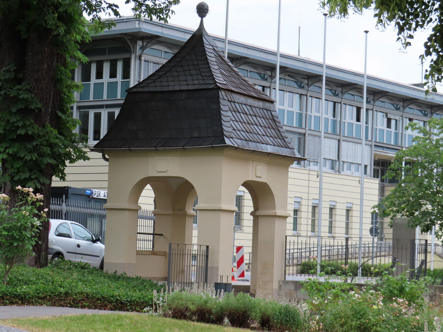 anbrachte. Davor ist auch eine Tafel mit diesem Bild vom Tor.